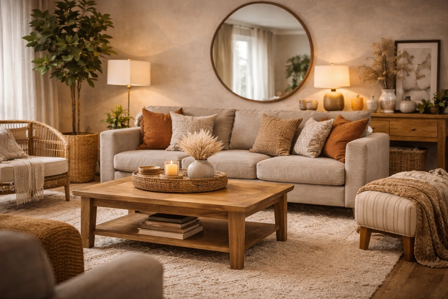Add simple touches that bring warmth. A few plants add soft color and life. Baskets hide clutter and give texture. Folded throws on chairs or sofas keep the space neat and cozy.