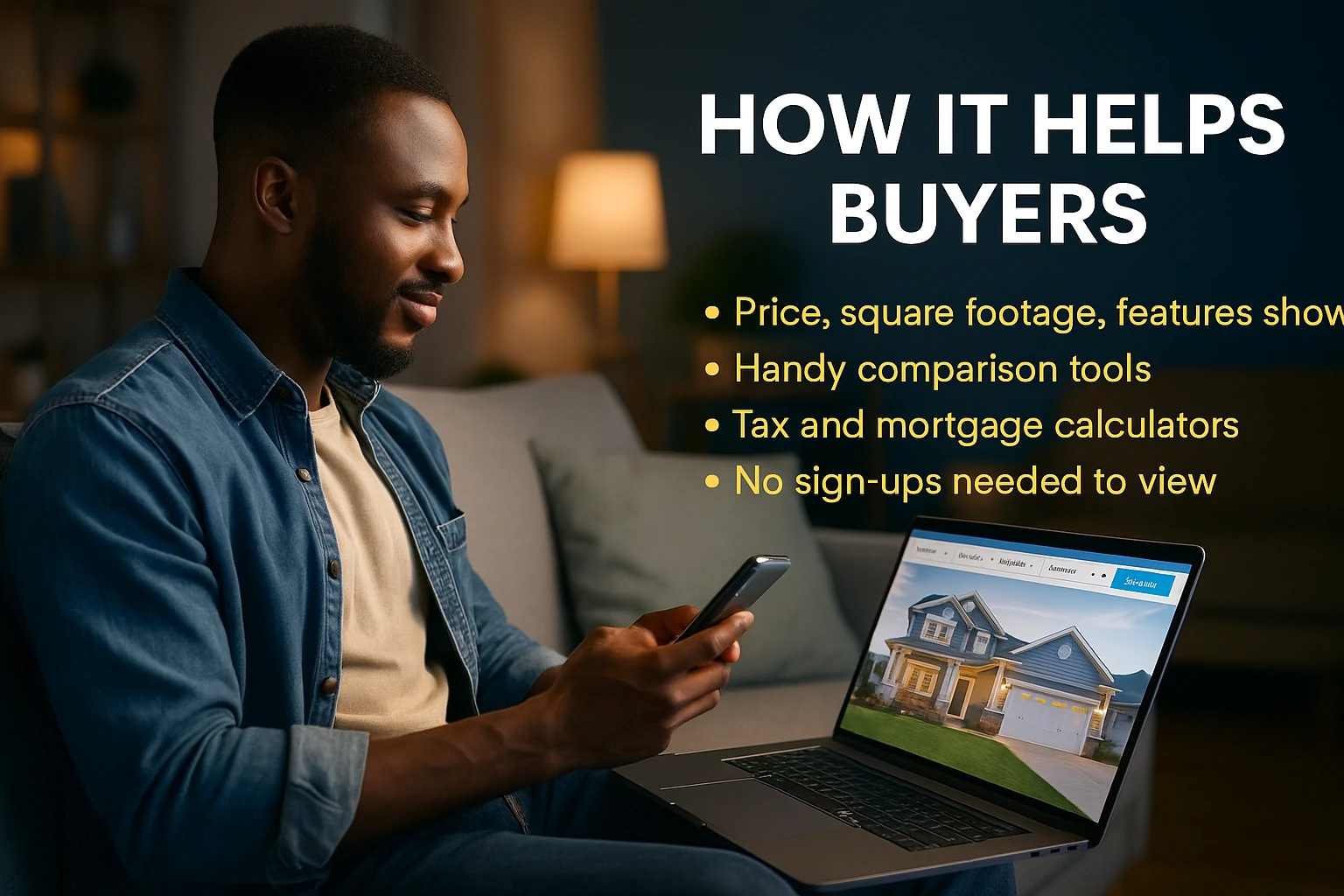 Man using phone and laptop to compare real estate listings with buyer tools on screen.