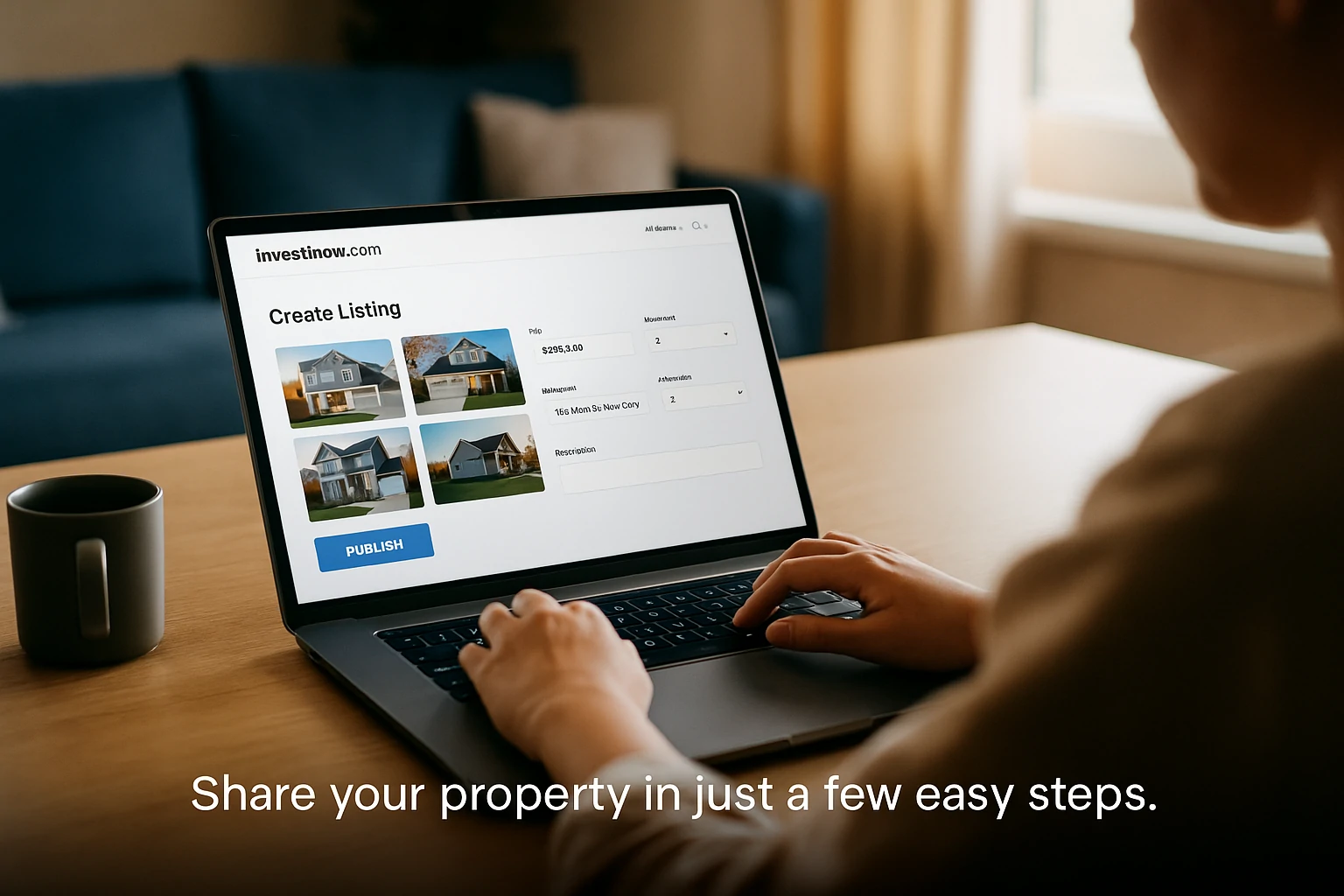 Person creating a real estate listing on Invest1now.com using a modern laptop